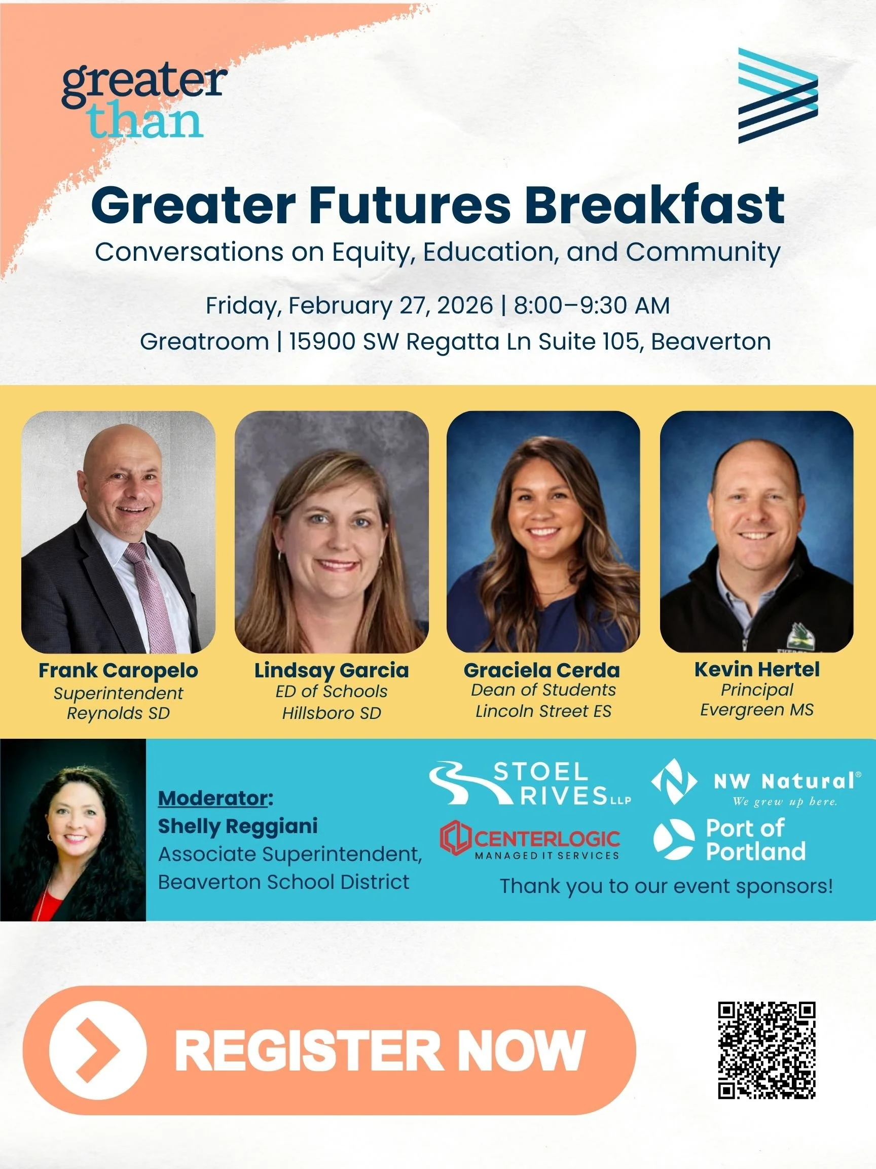 Join Greater Than for breakfast and conversation with local education leaders as we explore how equity and community partnerships create greater futures for students.